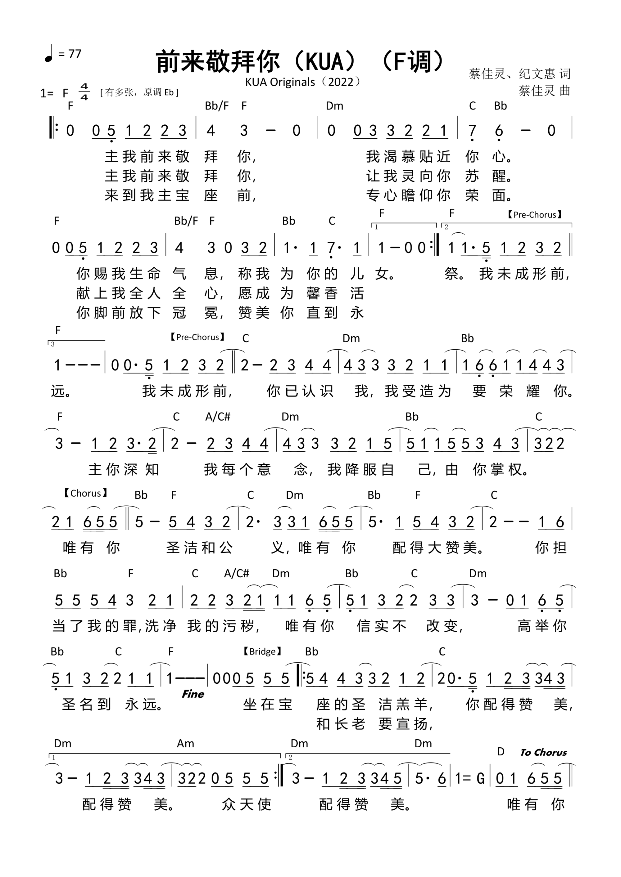 第2412首 - 前来敬拜你(KUA)(F调)和弦简谱